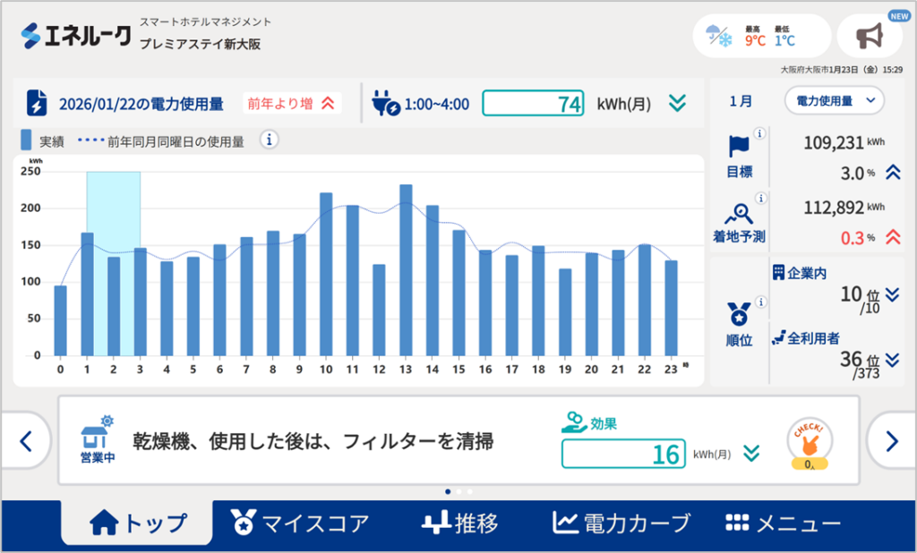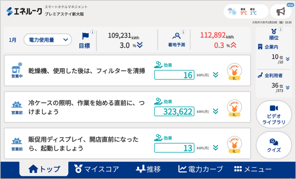 日々の使い方 事業所トップ画面の画面レイアウトを変更したい 2026.03.05 事業所画面のレイアウトは2種類用意しております。Aパターン:トップに前営業日と前年の使用量グラフを表示Bパターン:トップに常時省エネアクションを3つ表示 Aパターン Bパターン Aパターン、Bパターンの切替は、メニュー>基本情報設定>編集>システムパラメータでAパターン、Bパターンを選択>登録とすることで行えます。